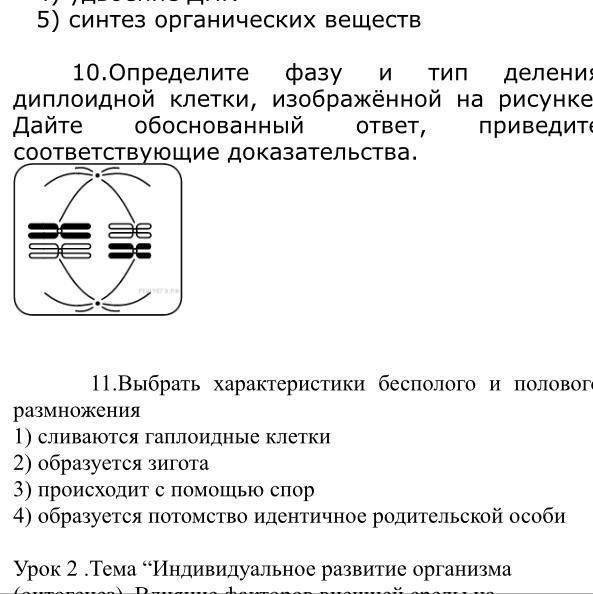 3) На схеме изображен мейоз - метафаза I мейоза, так хромосомы имеют по две хроматиды (представлены двумя парами). Выстраивание бивалентов в экваториальной плоскости клетки, прикрепление нитей веретена деления одним концом к центриолям, другим – к центромерам хромосом.