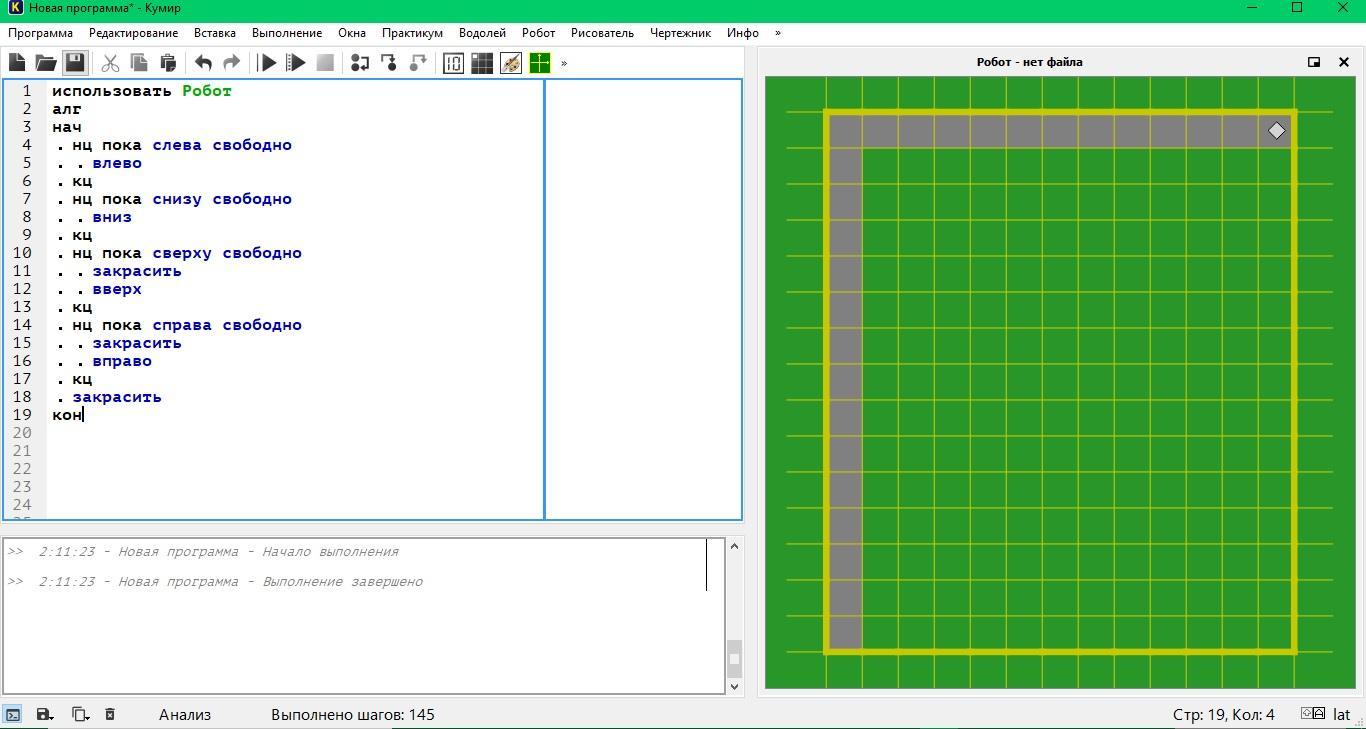 В центре бесконечного поля находится Робот. Напишите в тетради программу, которая закрашивает клетки справа от левой стены и под верхней стеной, как показано на обстановке.