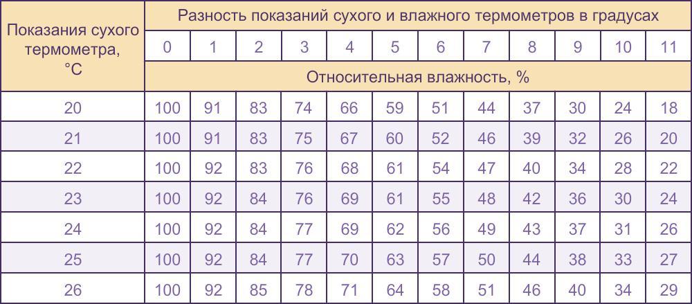 Разность показаний термометров (влажного и сухого) составляет 1 °С. Определите относительную влажность воздуха. При решении воспользуйтесь данными из таблицы.