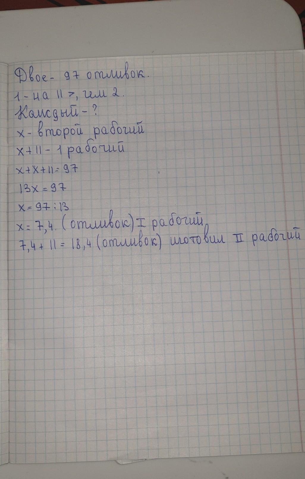 Двое рабочих изготовили 97 отливок, причем первый изготовил на 11 отливок больше, чем второй. Сколько отливок изготовил каждый рабочий?