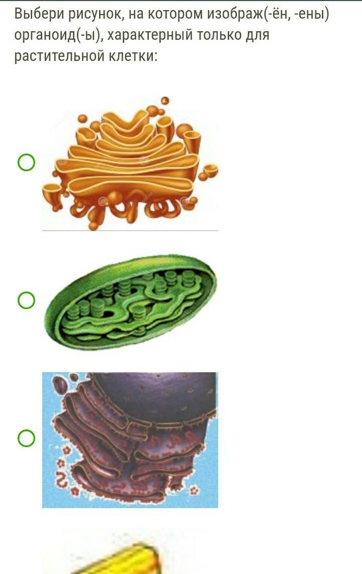 Выбери рисунок, на котором изображ(-ён, -ены) органоид(-ы), характерный только для растительной клетки: