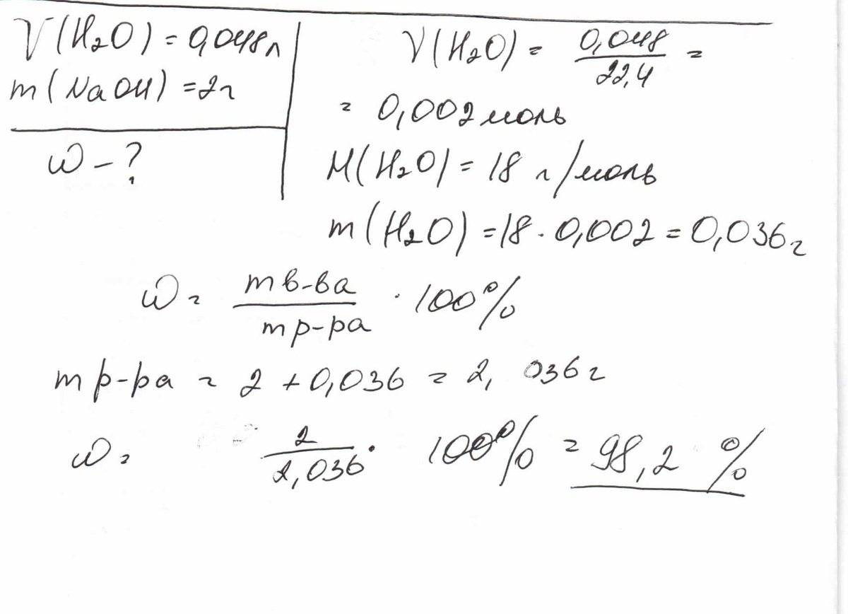 В воде объемом 48 мл растворили гидроксид натрия массой 2 г. Определите массовую долю в процентах растворенного вещества в полученном растворе.