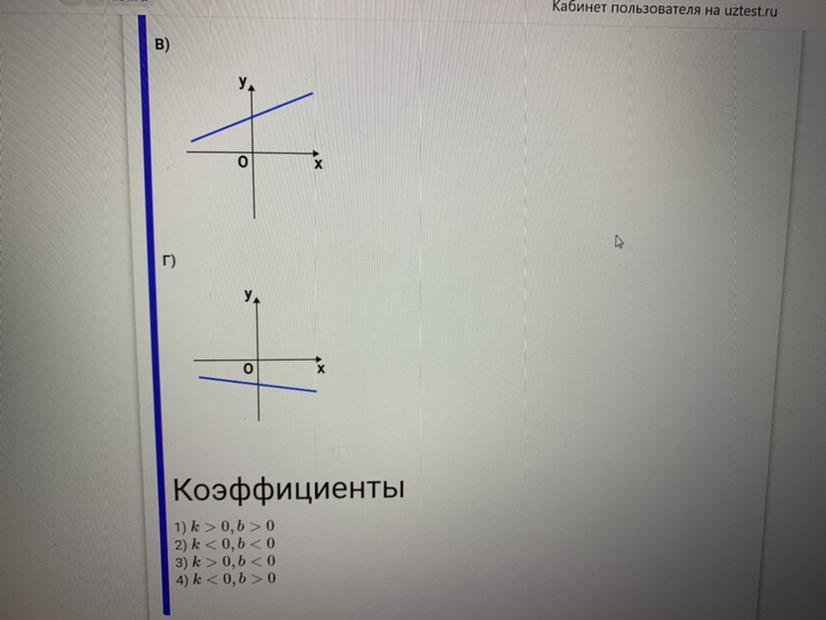 Ответ: в ). 1) k > 0 ; b > 0 ; г ). 2) k < 0 ; b < 0 .