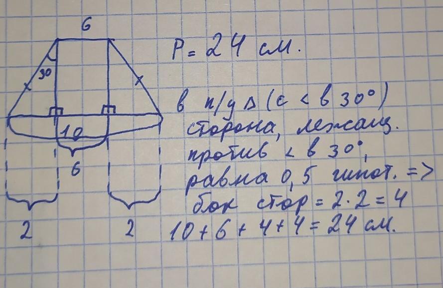 В равнобедренной (равнобокой) трапеции высота образует с боковой стороной угол 30°, а ее основания равны 10 см и 6 см. Чему равен периметр трапеции?