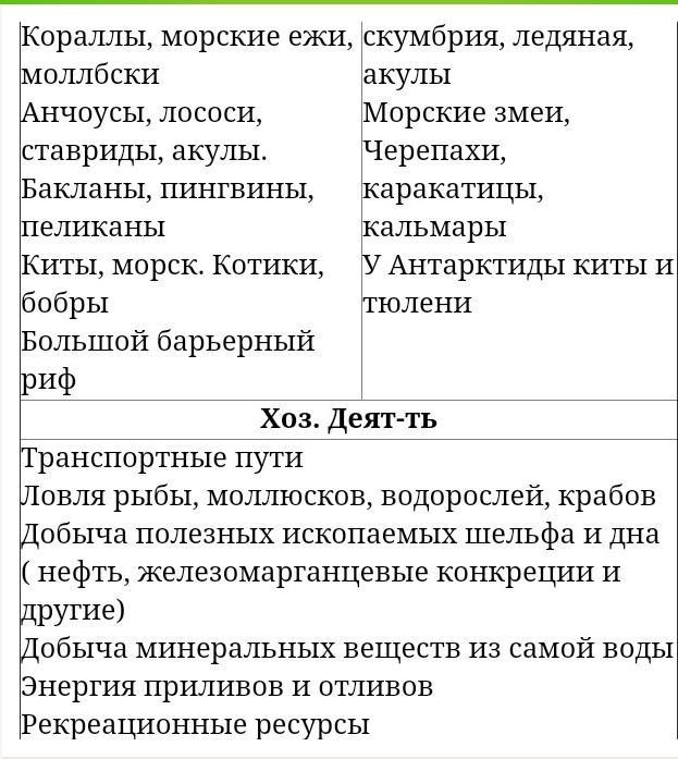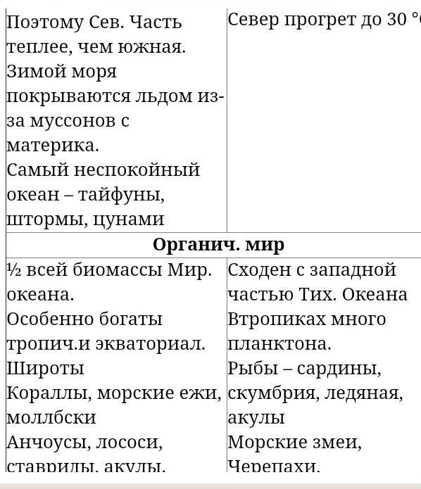 заполнить таблицу таблицу или ментальную карту по Тихому и Индийскому океанам.