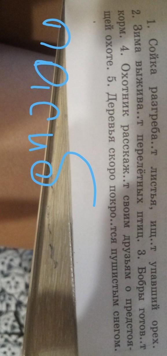 Разгребает (что?) листья, ищет (что?) орех, выживает (кого?) птиц, готовят (что?) корм, расскажет (кому?) друзьям, расскажет (о чём?) об охоте, покроются (чем?) снегом.