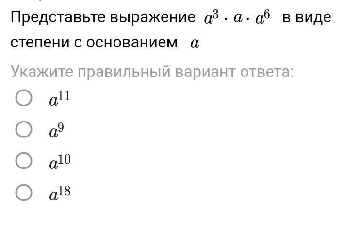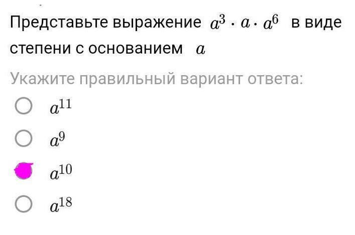 a³ · a · a⁶ = a³⁺¹⁺⁶ = a⁴⁺⁶ = a¹⁰