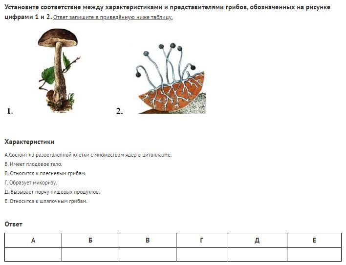 Установите соответствие между характеристиками и представителями грибов, обозначенных на рисунке цифрами 1 и 2.