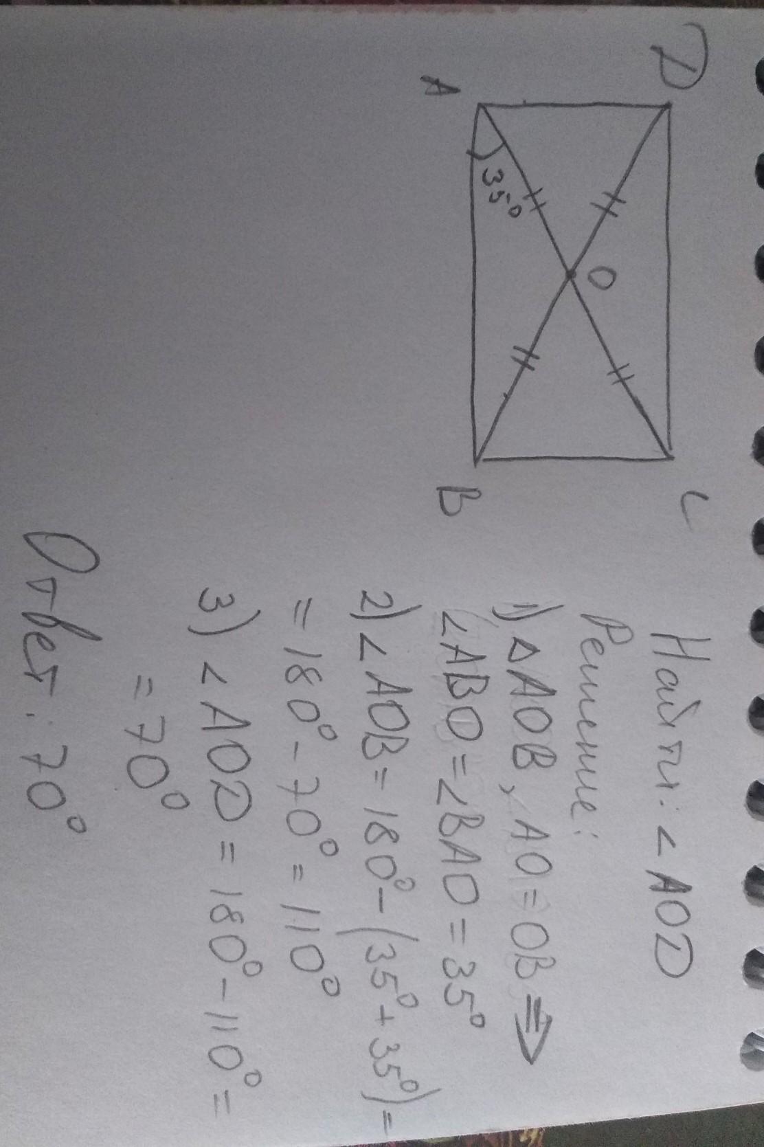 Диагональ прямоугольника образует угол 350 с одной из его сторон. Найдите острый угол между диагоналями этого прямоугольника. Ответ дайте в градусах.