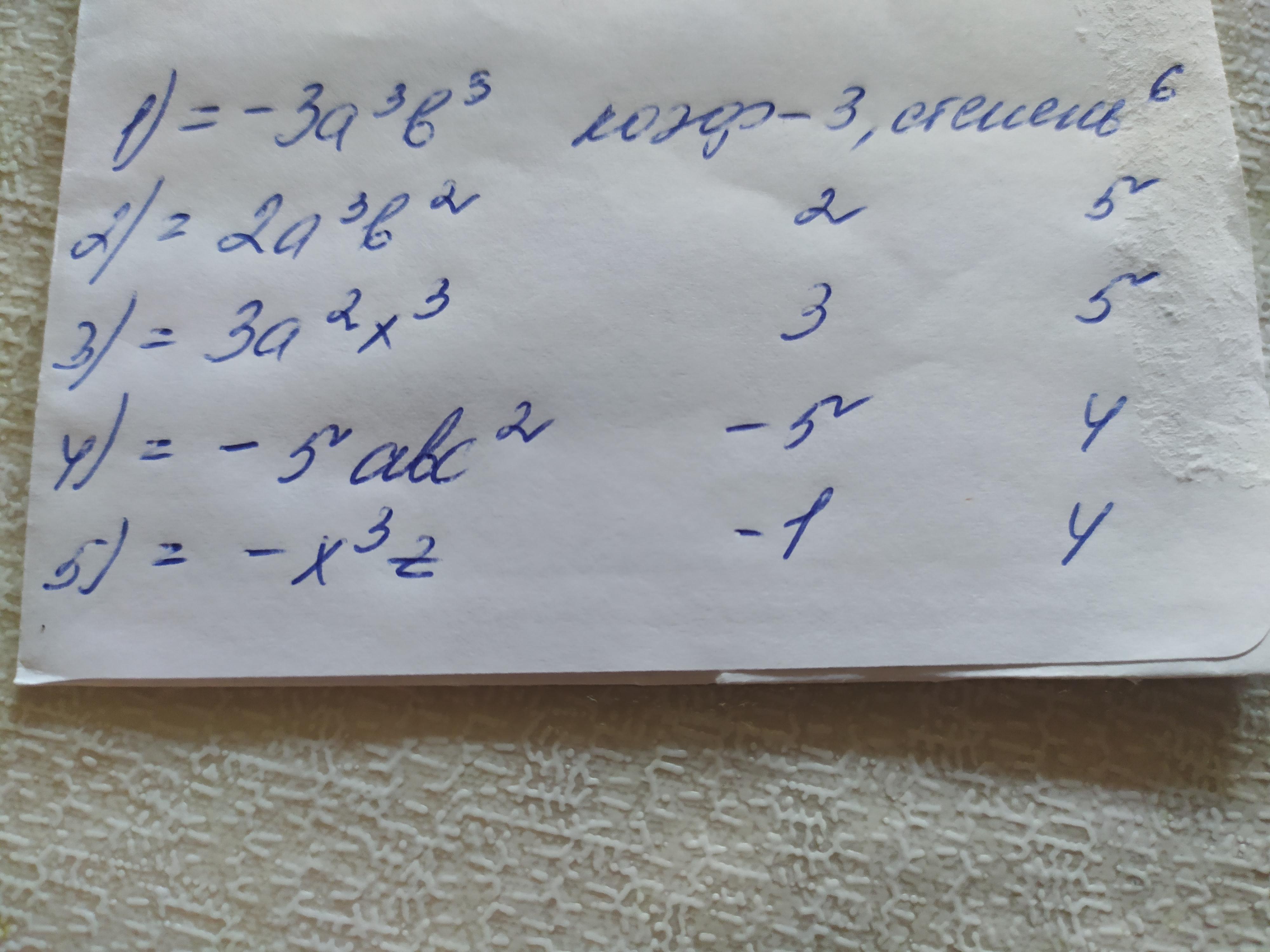 найти коэффициент стандартную форму и степень этих одночленов -3а²в³*а.