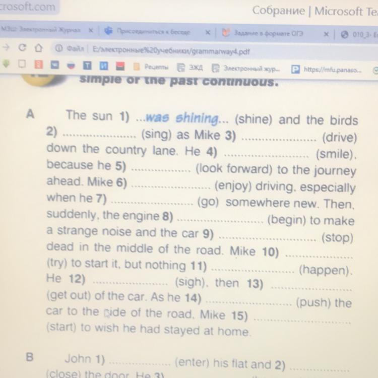 The sun was shining and the birds were singing as Mike was driving down the country lane. He was smiling because he was looking forward to the journey ahead. Mike enjoyed driving, especially when he went somewhere new. Then, suddenly, the engine began to make a strange noise and the car stopped dead in the middle of the road. Mike tried to start it, but nothing happened. He sighed, then got out of the car. As he was pushing the car to the side of the road, Mike started to wish he had stayed at home.