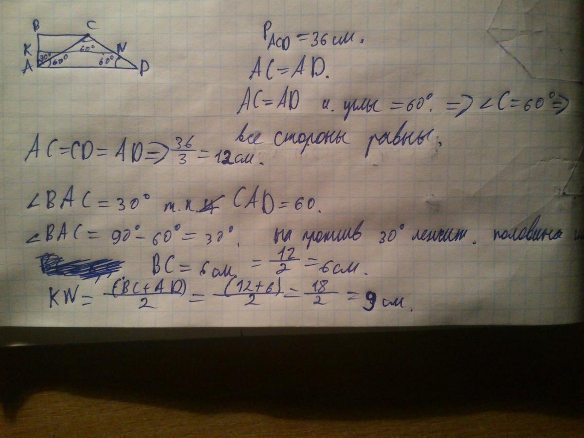 В прямоугольной трапеции АВСД меньшая диагональ АС составляет с основание угол 60 градусов. Периметр треугольника АСД равен 36 см. Вычислить длину средней линии трапеции, если АС=АД. ( решение)