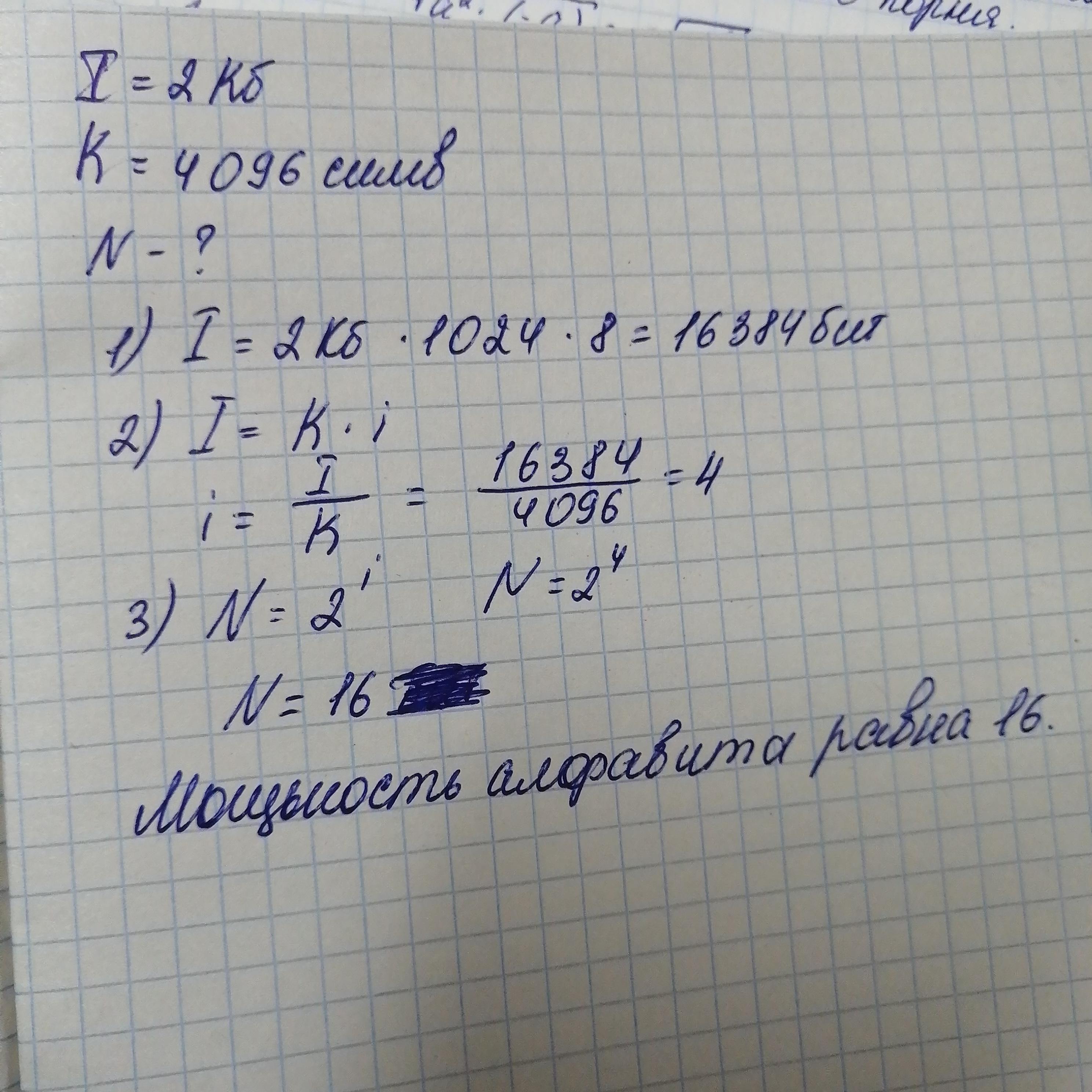 Объем сообщения равен 2 Кбайт. Сообщение содержит 4096 символов. Какова мощность алфавита, с