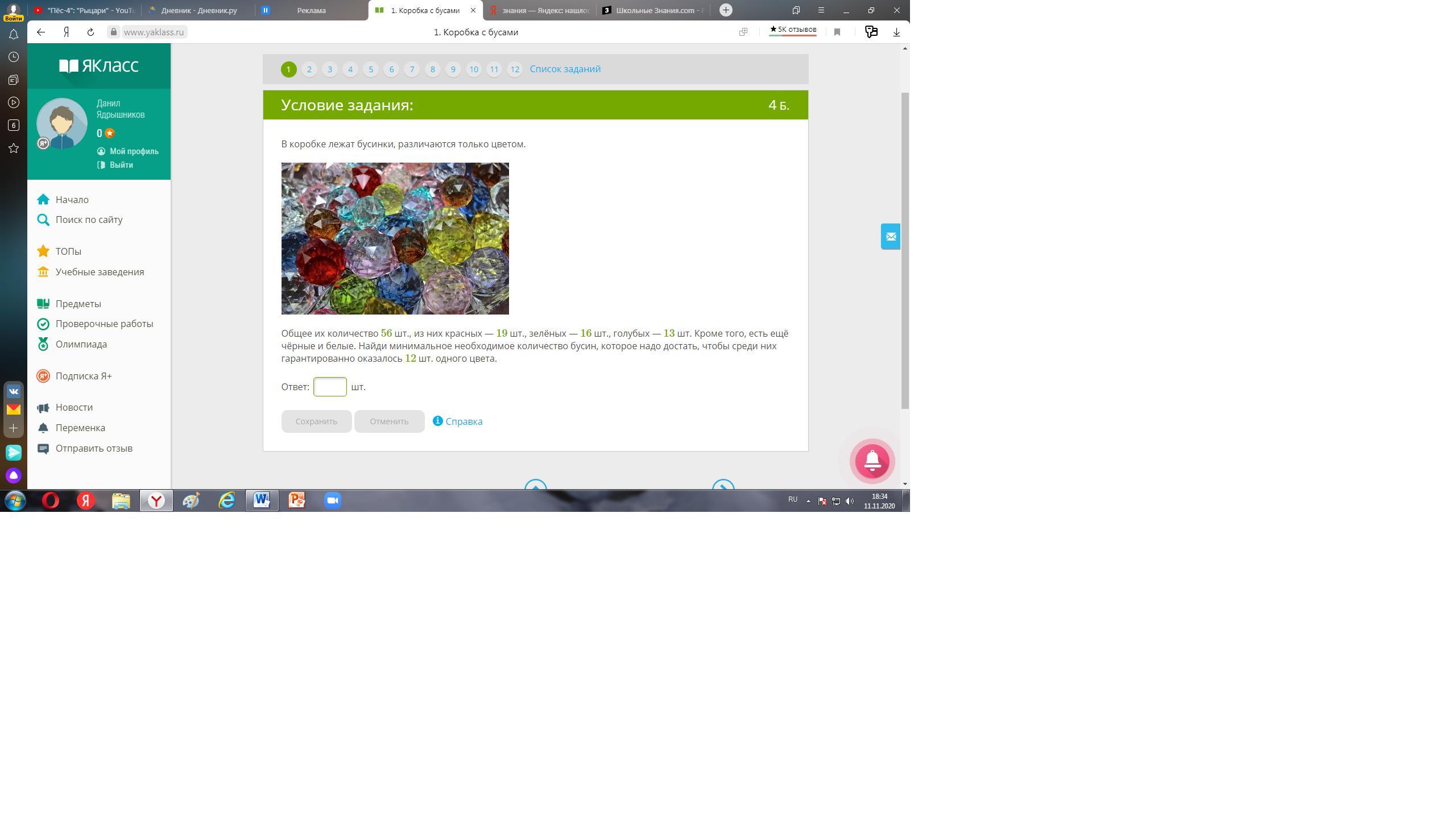 Минимальное непроходное значение шариков это 11 в худшем случае мы можем вытянуть по 11 шариков каждого цвета и на следующий ход точно будет 12 шариков одного цвета