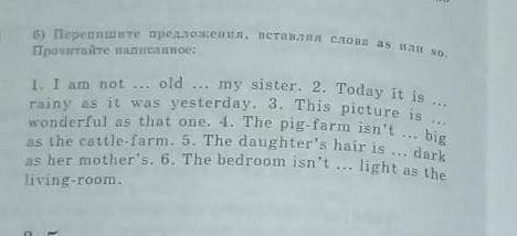 1 I'm not as old as my sister. 2. Today it is as rainy as it was yesterday, 3This picture is as wonderful as that one. 4. The pig-farm isn't so big as the cattle - farm. 5 the daughter's hair is as dark as her mother's. 6m The bedroom isn't so light as the living room