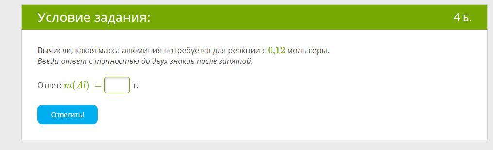 Вычисли, какая масса алюминия потребуется для реакции с 0,12 моль серы.
