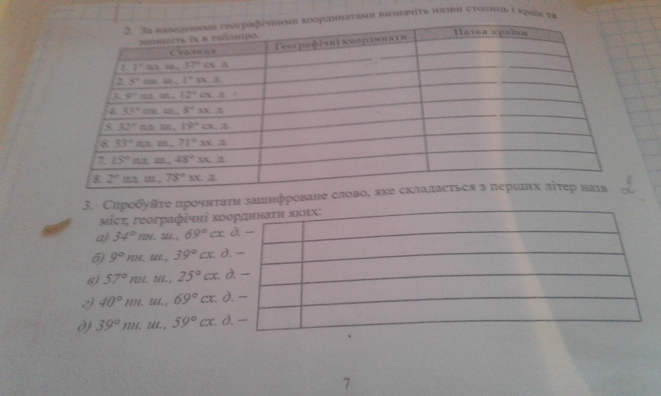 Открываешь атлас, там на политической карте по координатам которые указаны в таблице находишь точку на карте, записывай первую букву названия♀️
