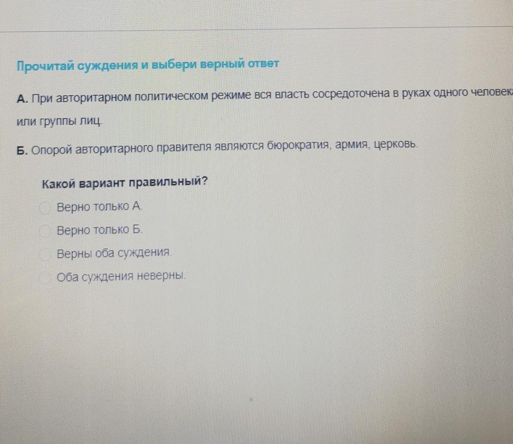 Верны оба суждения, так как оба - характеристики авторитарного политического режима