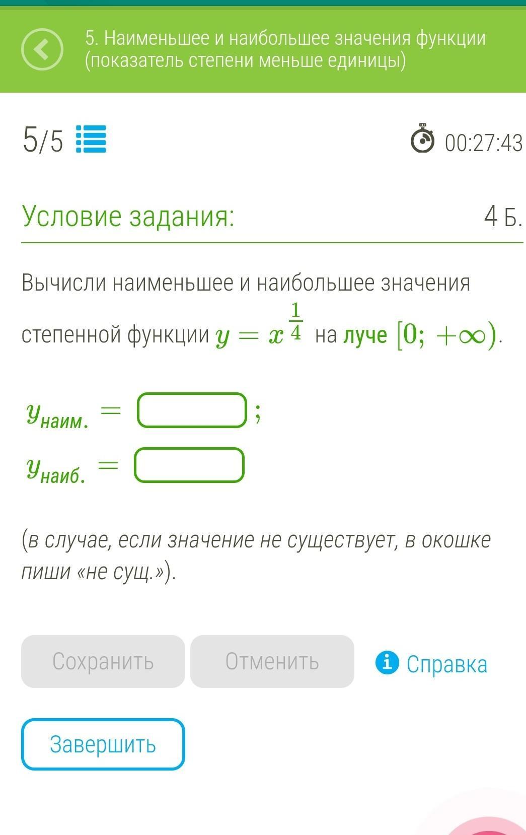 наименьшее значение будет в точке 0. Наибольшего нет. Если взять производную ,то получим 1/4 *х в степени-3/4 эта функция не равна 0 ни при каком х. значит минимума или максимума внутри функции нет. Значит надо проверить концы . 0 включен в область . ставим х=0 и получаем 0. это минимум. максимума нет так как при возрастании х и корень его растет.