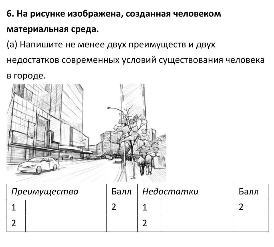 (a) Напишите не менее двух преимуществ и двух недостатков современных условий существования человека в городе.