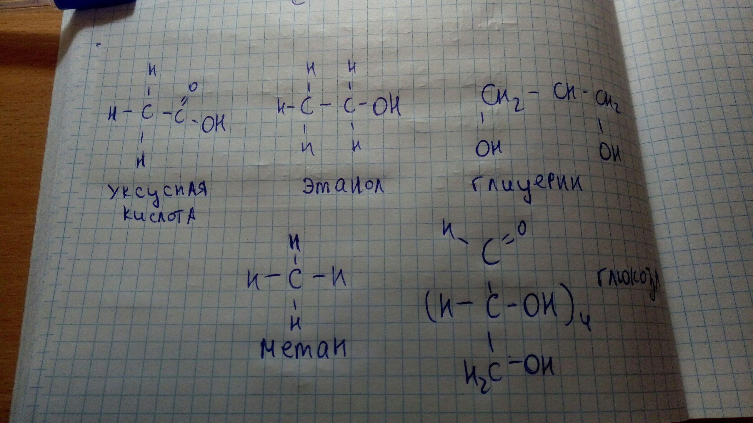 На фотографии: уксусная кислота, этанола, глициния, метан, глюкоза.