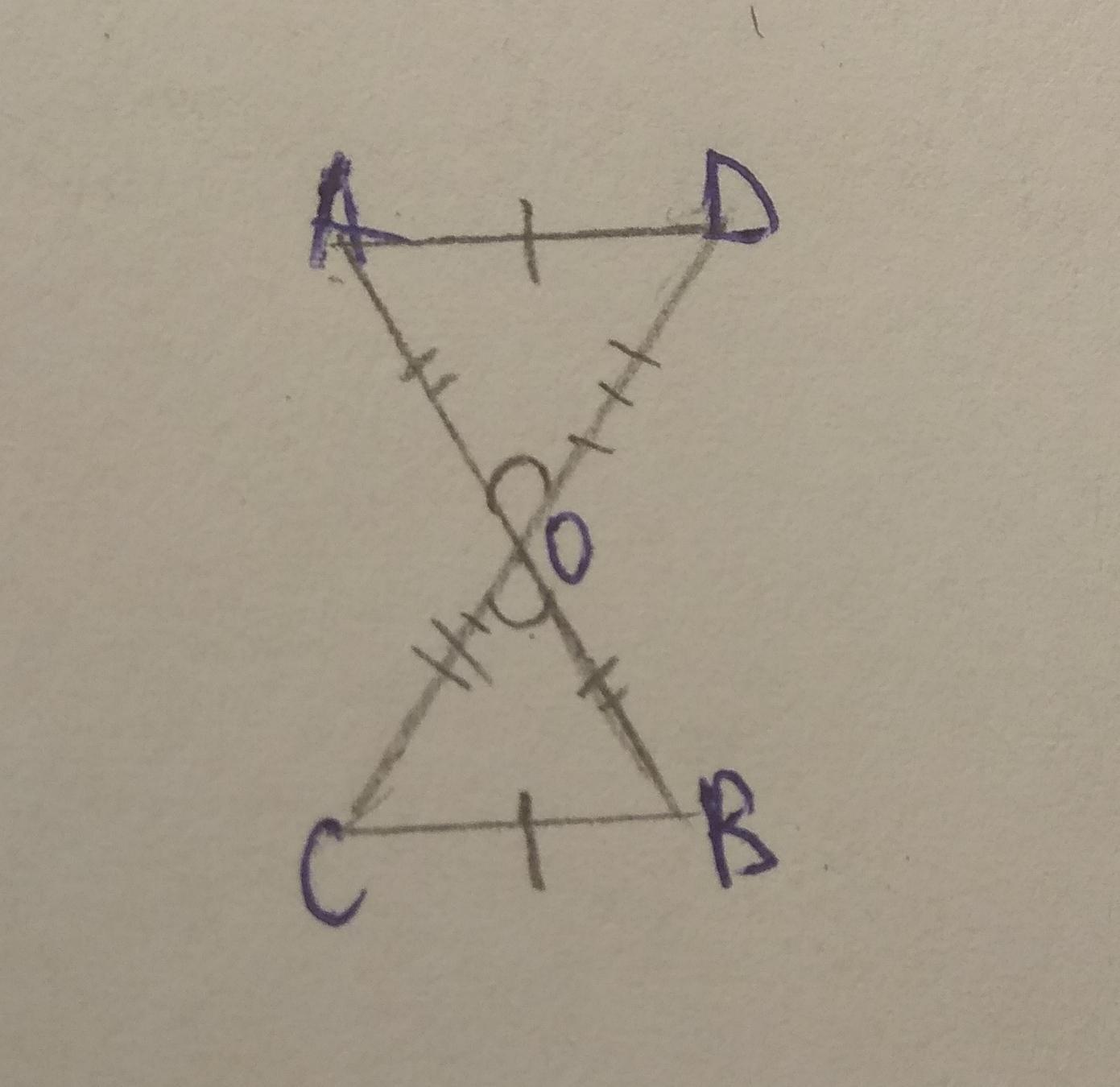 Два равных отрезка AB и CD пересекаются в точке O так, что расстояния AD и CB равны. Докажите, что AO=CO.