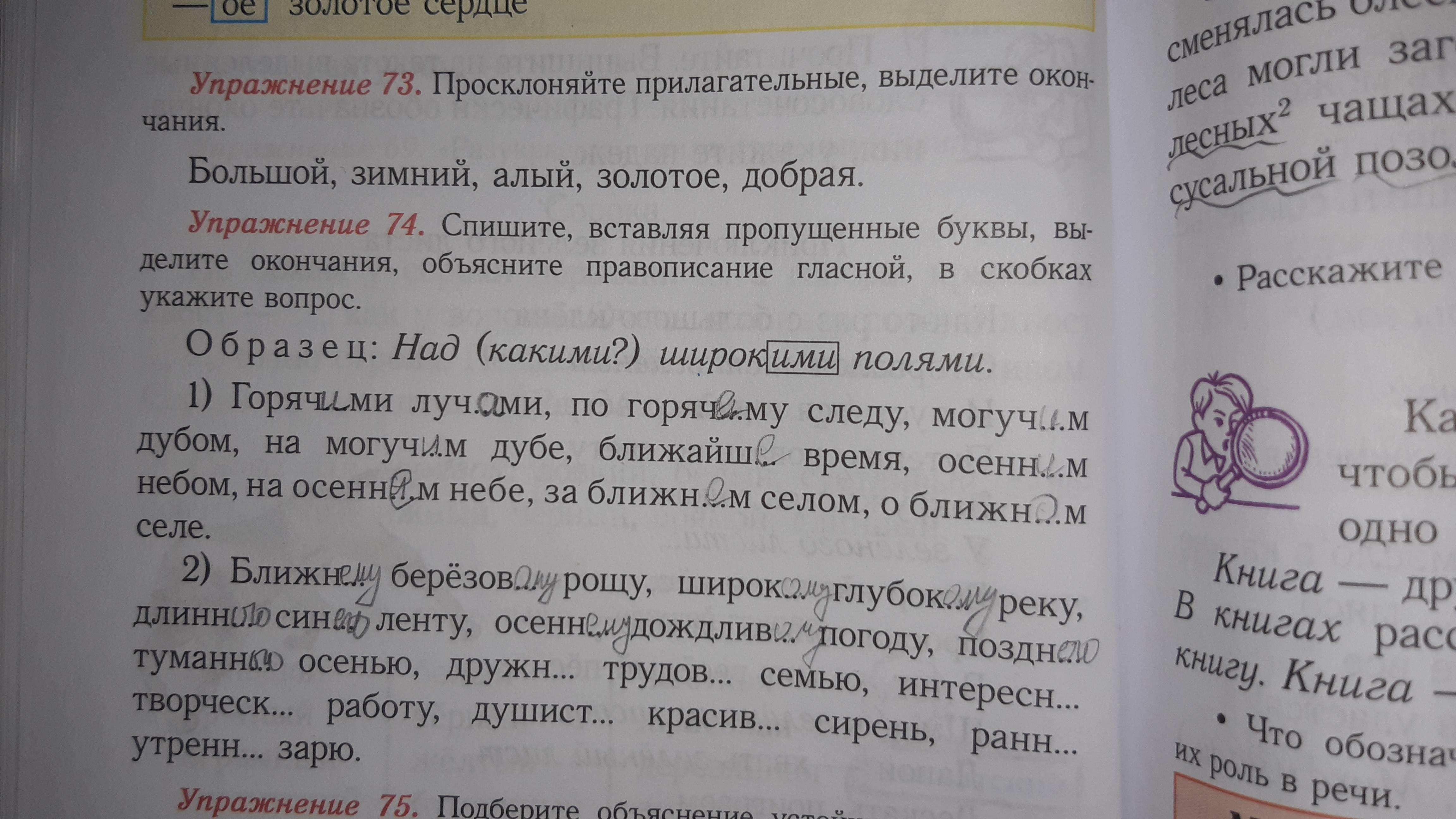 2) ближнюю березовую рощу (что?), широкую, глубокую реку (что?), длинную, синюю ленту (что?), осеннюю, дождливую погоду (когда?), позднюю, туманную погоду (когда?), дружную, трудовую семью (с кем?), интересную, творческую работу (что?), душистая, красивая сирень (что?), раннюю, утреннюю зарю (что?).