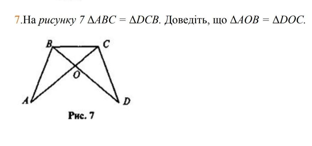2) ∆АВС = ∆DCB по условию. В равных фигурах соответственные элементы равны, значит сторона АО=DO, a сторона AB=DC.