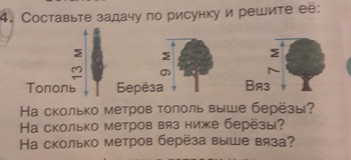 Ответ: На сколько метров тополь выше берёзы, если высота тополя 13м ,а высота берёзы на 4м меньше.