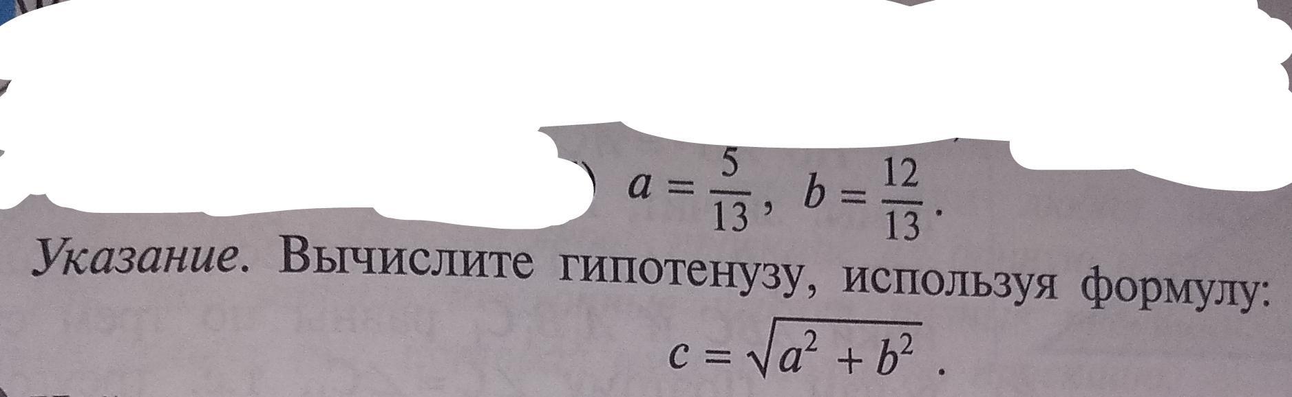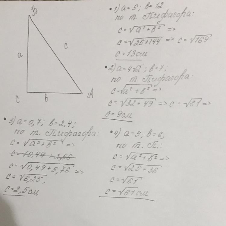 В прямоугольном треугольнике заданы катеты a и b найдите гипотенузу c, если: ,1)a=5, b=12; 2)a=4√2, b=7; 3)a=0.7, b=2.4;4)a=5, b=6; 5)