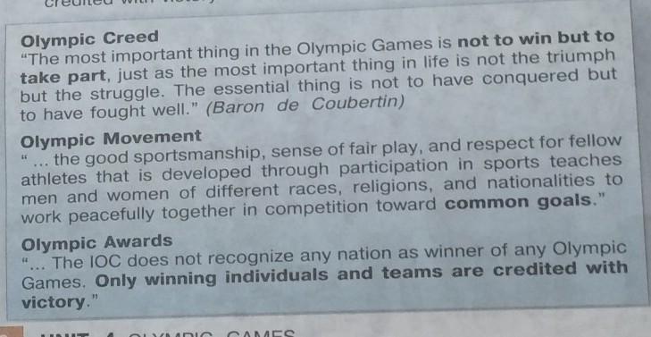 Олимпийский кредо «Самое главное в Олимпийских играх - не побеждать, а принимать участие, так же как самое важное в жизни - не победа, а борьба. Главное - не побеждать, а хорошо сражаться. " (Барон де Кубертен) Олимпийское движение ... хорошее спортивное мастерство, чувство честной игры и уважение к другим спортсменам, которые развиваются благодаря занятиям спортом, учит мужчин и женщин разных рас, религий и национальностей мирно работать вместе в соревновании за общие цели. «Олимпийские награды» ... МОК не признает ни одну страну победителем каких-либо Олимпийских игр. Только победившие индивидуумы и команды засчитываются победой ».