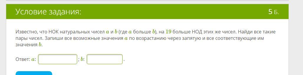 Известно, что НОК натуральных чисел a и b (где a больше b), на 19 больше НОД этих же чисел. Найди все такие пары чисел. Запиши все возможные значения a по возрастанию через запятую и все соответствующие им значения b.