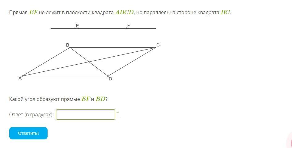 Т.к. ЕF || BC и лежит в плоскости квадрата, то угол между EF и BD равен углу между BC и BD. Угол между стороной квадрата и его диагональю всегда 45°