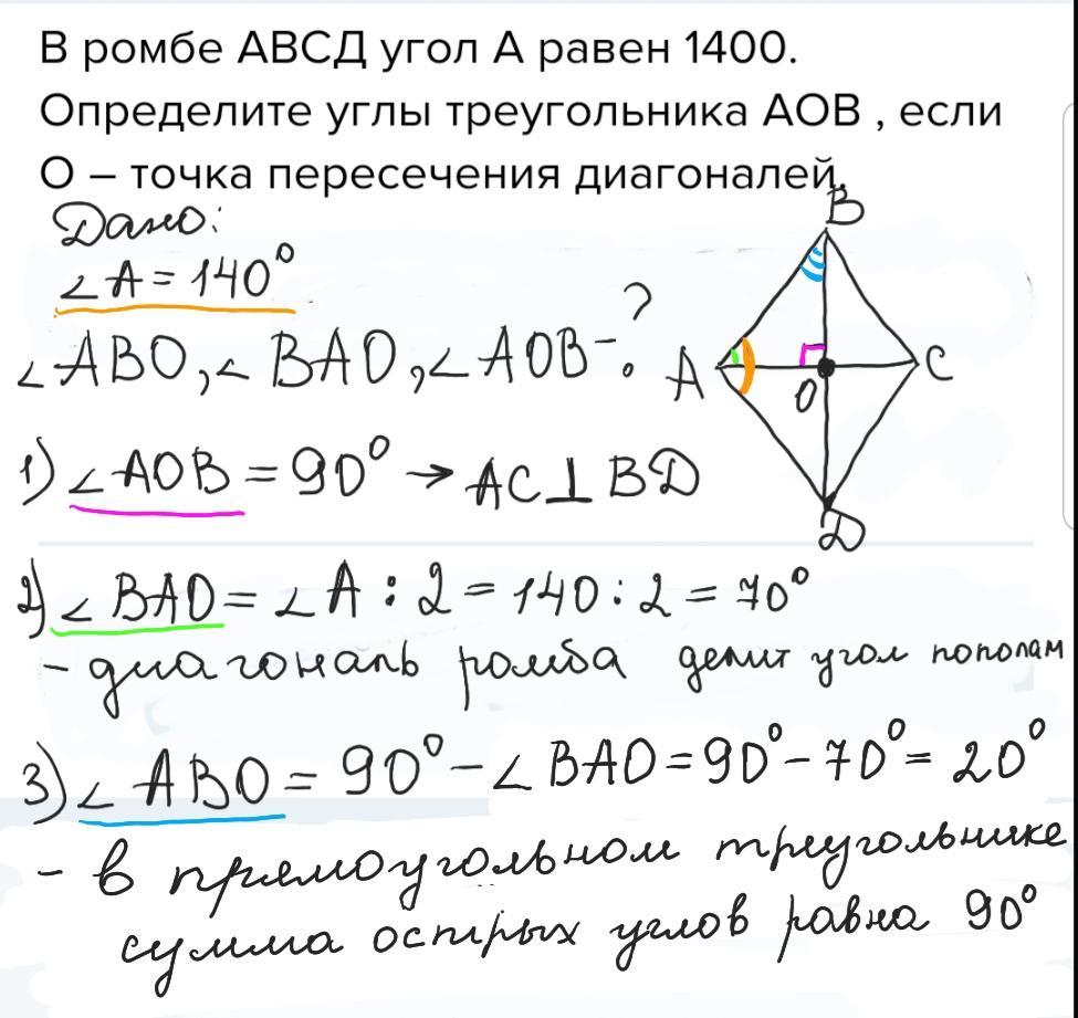 В ромбе АВСД угол А равен 1400. Определите углы треугольника АОВ , если О – точка пересечения диагоналей.