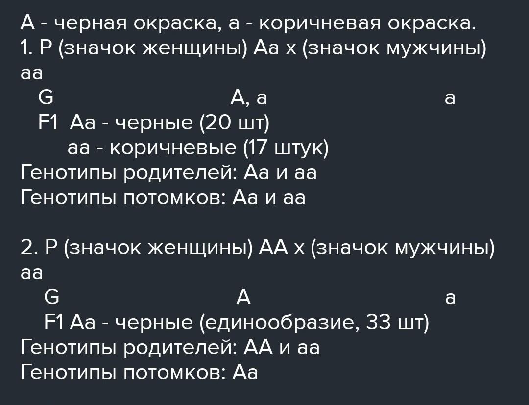 2 черные самки мыши скрещивались с коричневым самцом. Одна самка дала 20 черных и 17 коричневых а другая 33черных. Каковы генотипы родителей и потомков