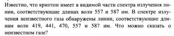 Известно, что криптон имеет в видимой части спектра излучения линии, соответствующие длинах волн 557 и 587 нм. В спектре излучения неизвестного газа обнаружены линии, соответствующие дли- нам волн 419, 441, 470, 557 и 587 нм. Что можно сказать о неизвестном газе?