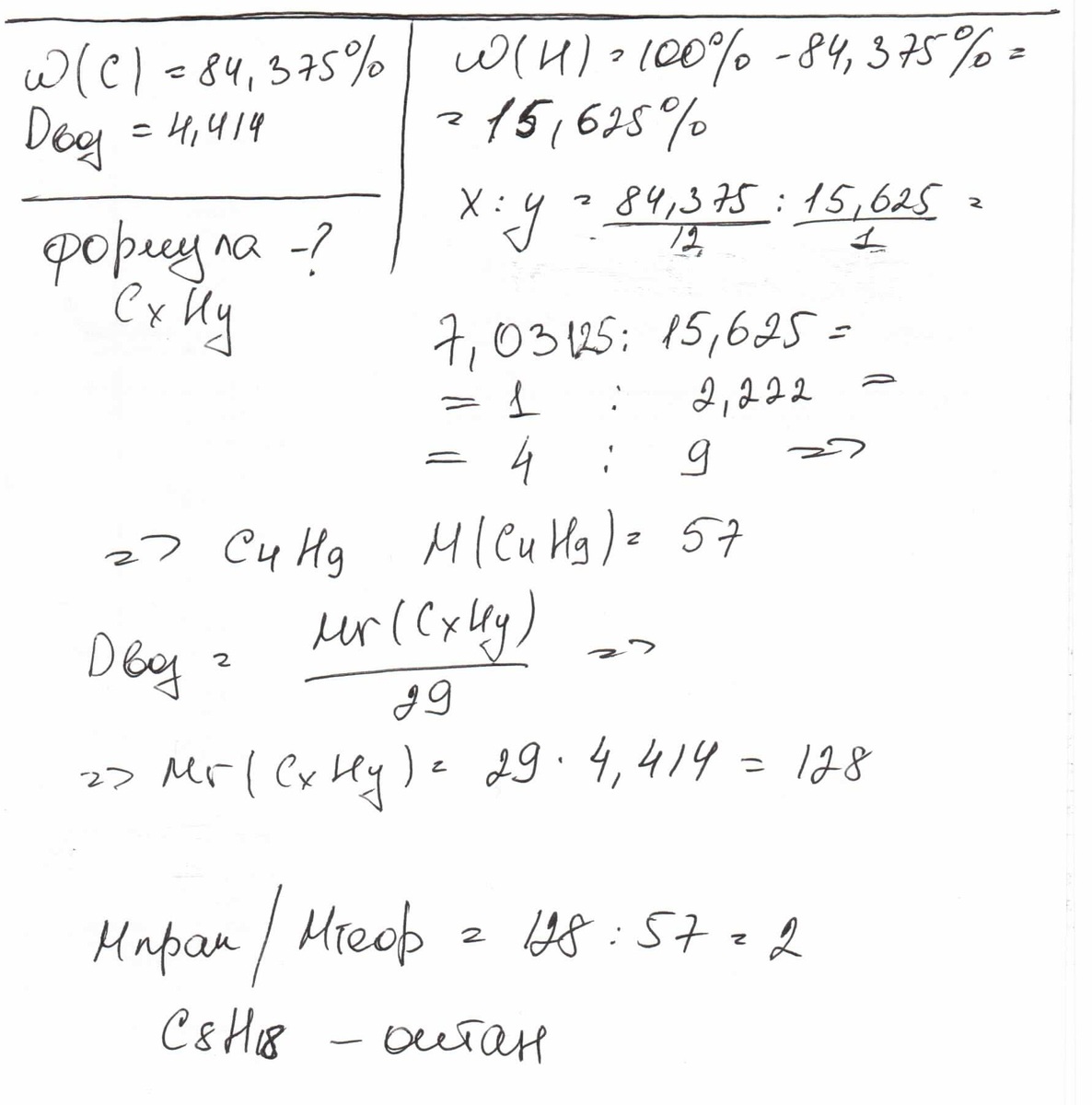 Определить молекулярную формулу вещества если массовая доля углерода 84,375%, остальное водород.Относительная плотность паров вещества по воздуху- 4,414
