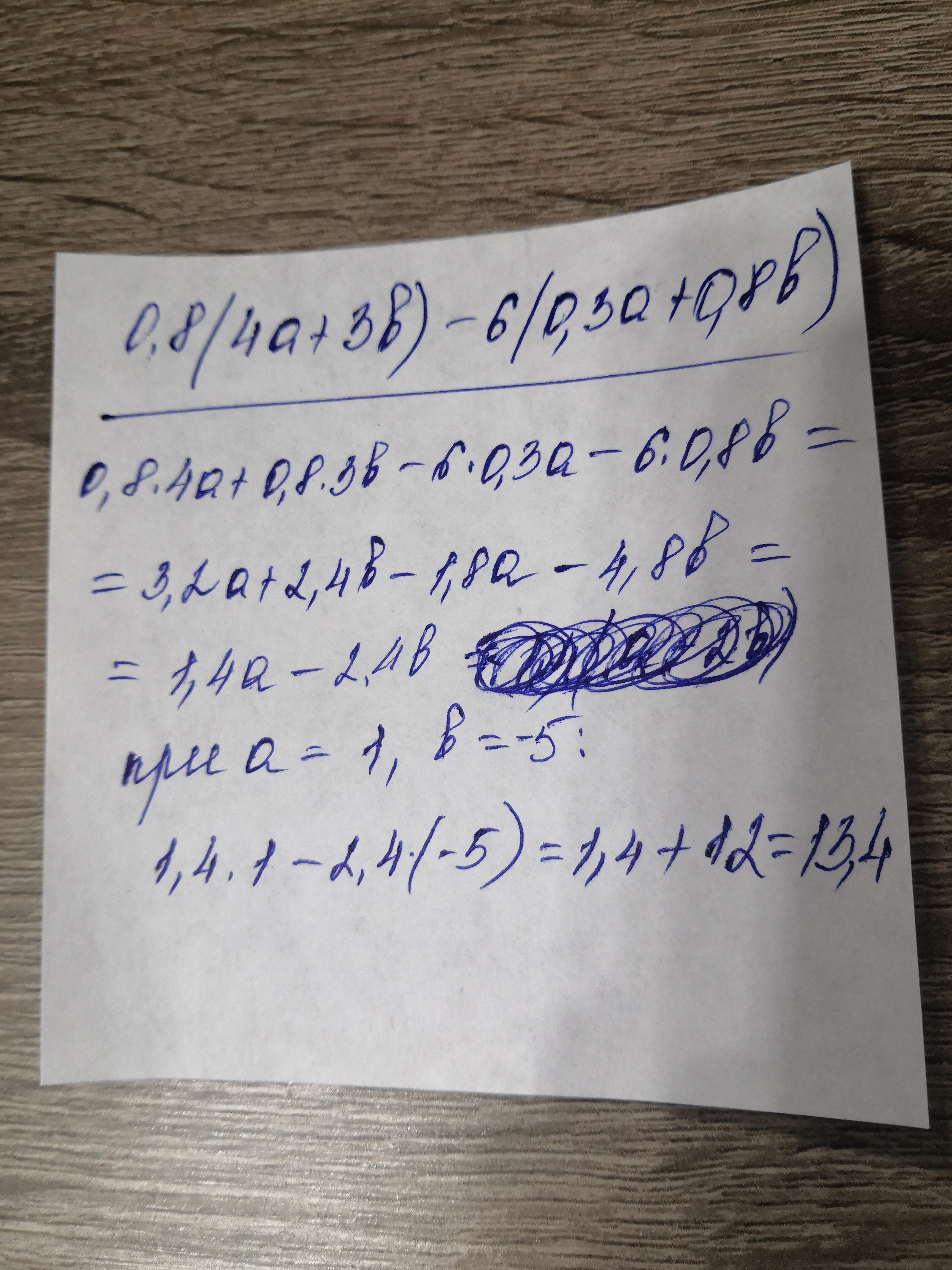 0,8(4a + 3b) − 6(0,3a + 0,8b) = 3,2a + 2.4b - 1.8a - 4.8b = 1.4a - 2.4b