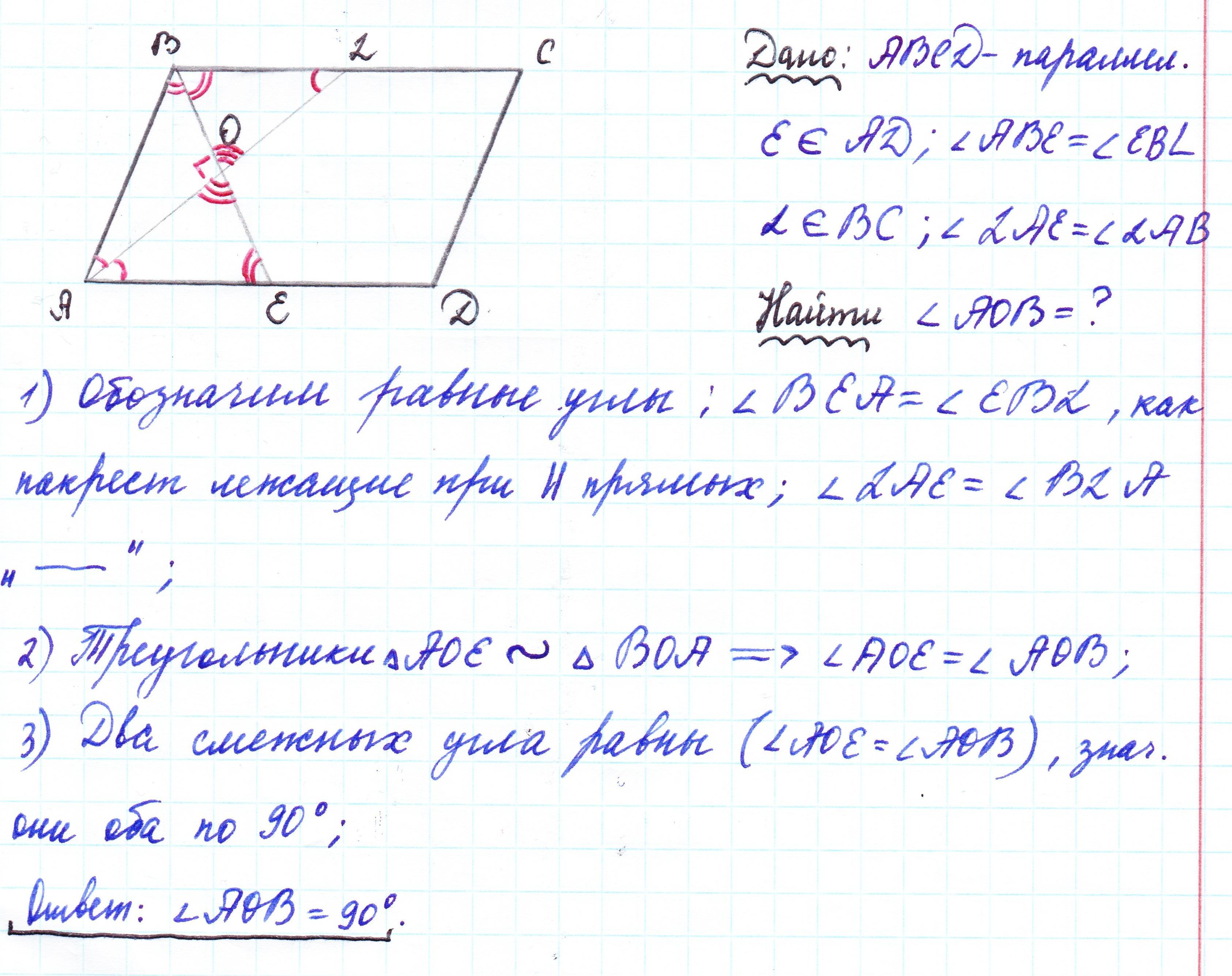 В параллелограмме ABCD биссектрисы AL и BE углов А и В соответственно пересекаются в точке О. Найдите угол АОВ. Ответ дайте в градусах.
