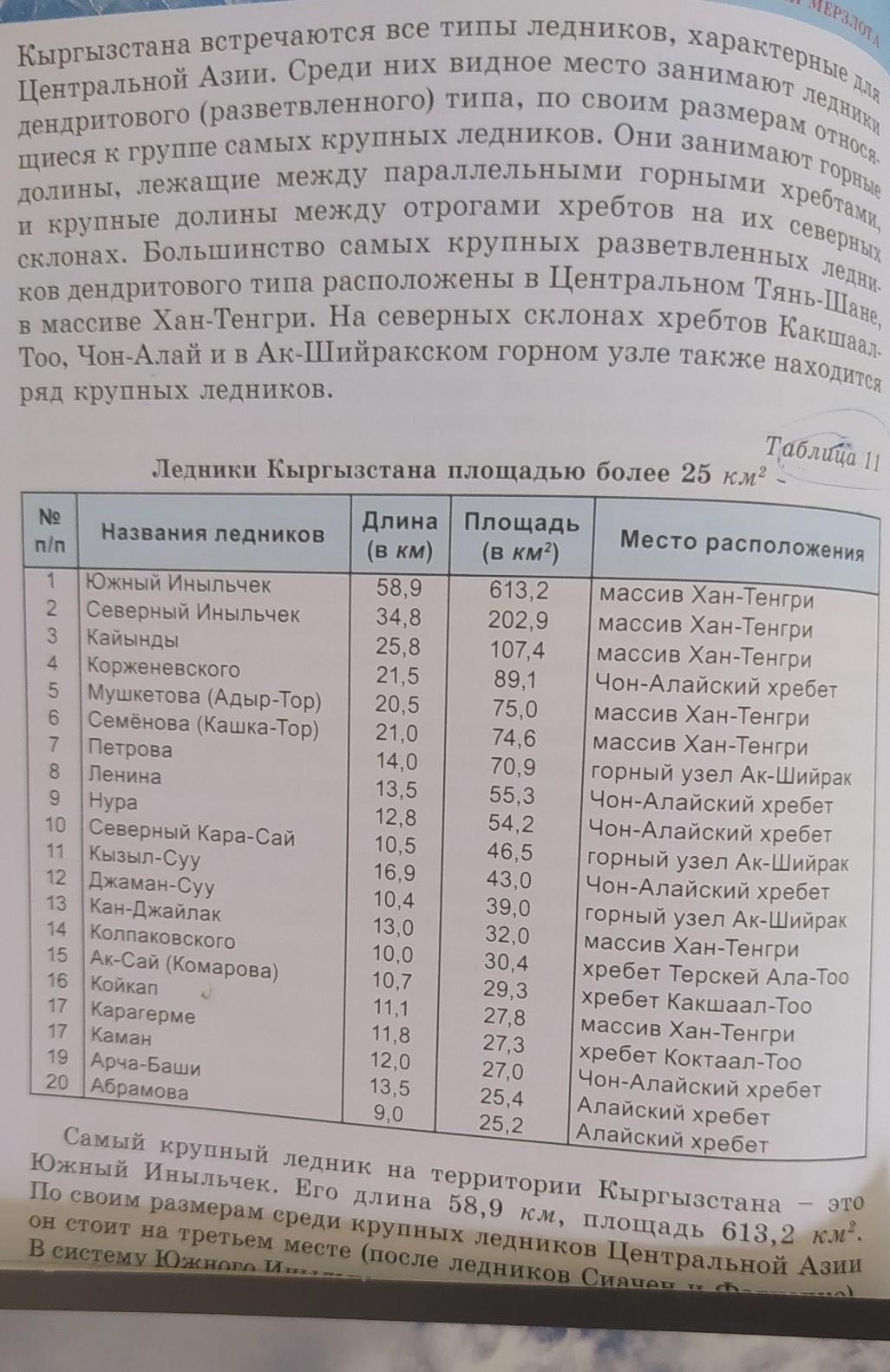 4. По таблице 11 назовите самый длинный ледник, занимающий первое по солнечности экспозиции на территории Кыргызстана.