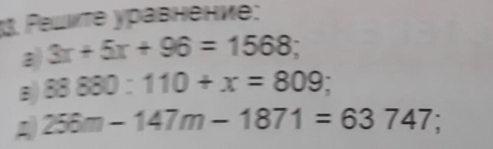 а)8х + 96 = 1568, 8х = 1568-96, 8 х = 1472, х=184. б) 808+ х = 809, х = 1. в) 109 m = 65618, m = 602.