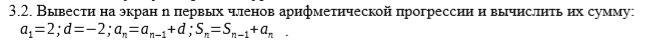 2. Вывести на экран n первых членов арифметической прогрессии и вычислить их сумму: a1=2;d=−2;an=an−1+d;Sn=Sn−1+an .