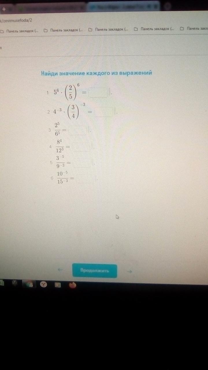 5^6*(2/5)^6=(5*2/5)^6=2^6=64. 4^-3*(3/4)^-3=(4*3/4)^-3=3^-3=1/3^3=1/27. 2^5/6^5=2^5/3^5*2^5=1/3^5=1/243. 8^4/12^3=64/27. 3^-5/9^-3=3^-5/3^-6=3. 10^-5/15^-3=15^3/10^5=27/800