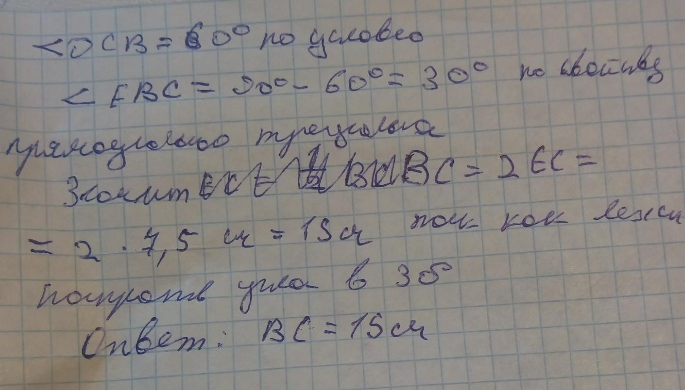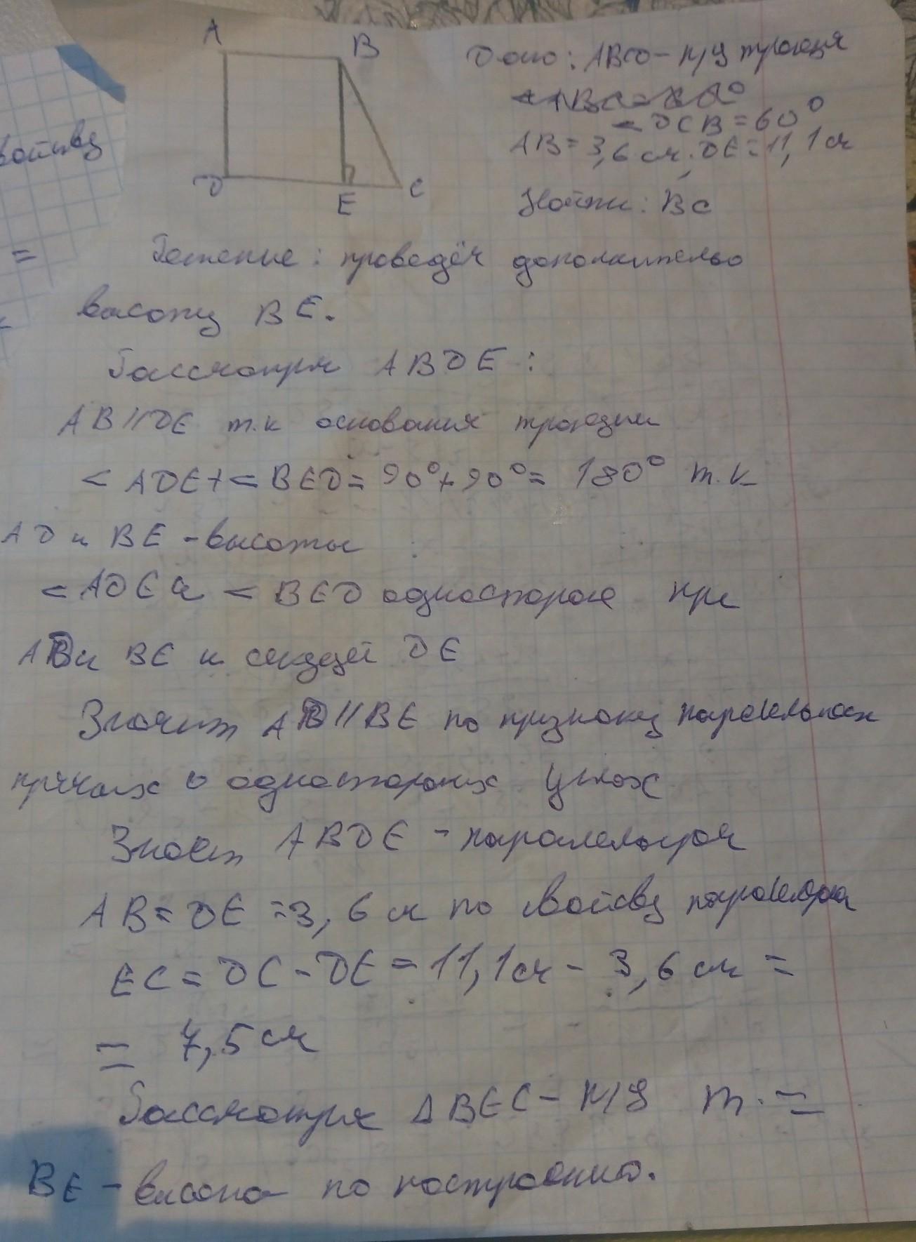 Определи длину большей боковой стороны прямоугольной трапеции, если один из углов трапеции равен 60°, меньшее основание — 3,6 см, большее основание — 11,1 см.