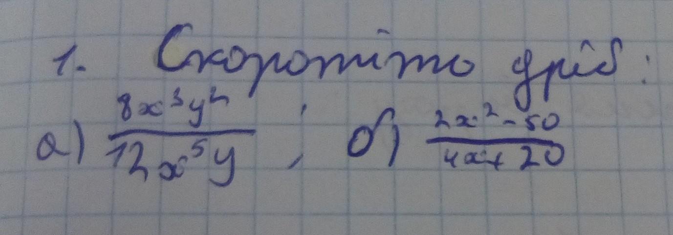 1)\frac{8x^{3}y^{2}}{12x^{5}y}=\frac{4x^{3}y*2y }{4x^{3}y*3x^{2}}=\frac{2y}{3x^{2}}\\\\\\2)\frac{2x^{2}-50}{4x+20}=\frac{2(x^{2}-25)}{4(x+5)}=\frac{(x+5)(x-5)}{2(x+5)}=\frac{x-5}{2}