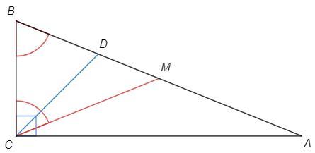 острый угол b прямоугольного треугольника abc равен 68. Найдите угол между биссектрисой cd и медианой cm, проведенными из вершины прямого угла c.