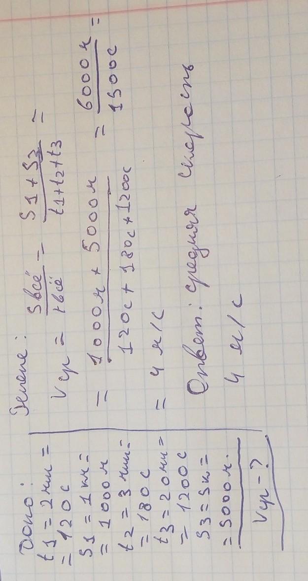 Велосипедист двигался с постоянной скоростью и проехал за 2 мин 1 км, затем 3 минуты накачивал колесо, а потом проехал еще 5 км за 20 мин. Определите среднюю скорость велосипедиста на всем маршруте. Ответ дайте в м/с.