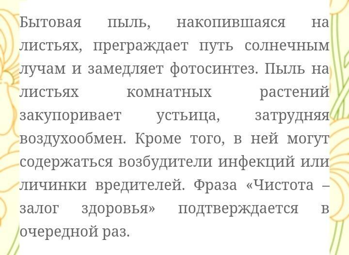 Бытовая пыль, накопившаяся на листьях, преграждает путь солнечным лучам и замедляет фотосинтез. Пыль на листьях комнатных растений закупоривает устьица, затрудняя воздухообмен. Кроме того, в ней могут содержаться возбудители инфекций или личинки вредителей. Фраза «Чистота – залог здоровья» подтверждается в очередной раз.