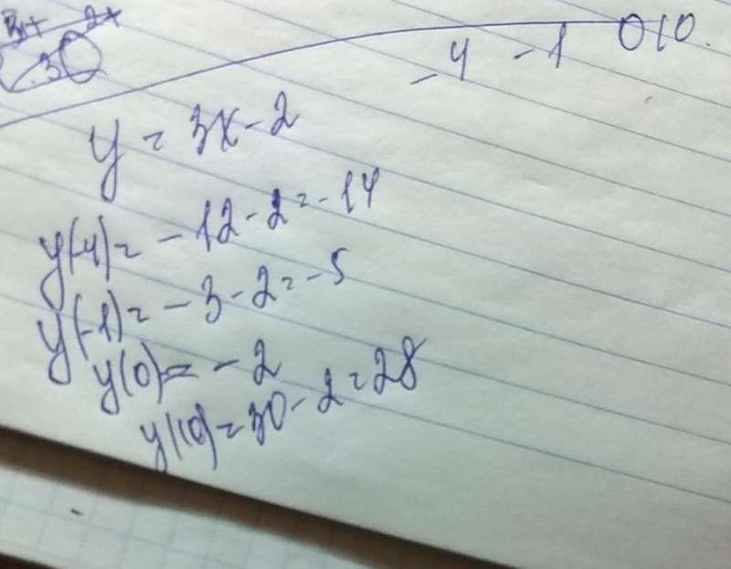 помогите пожалуйста решить 1.функция задана формулой у=3х-2.Найдите значение функции, соответствующее значение аргумента ,равному -4;-1,0;10. 2.функция задана формулой у=5х+4.найдите значение аргумента,при котором значение функции равному -6;28 3.найдите область определения функции у= 7/3+х . (1 пожалуйста с таблицой )
