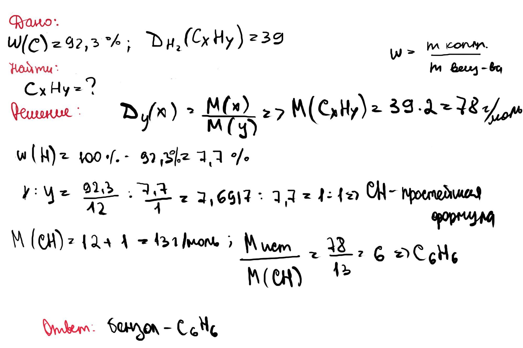 задача та что слева Выведите формулу углеводорода, в состав которого входит 92,3% углерода, а относительная плотность его по водороду-39.